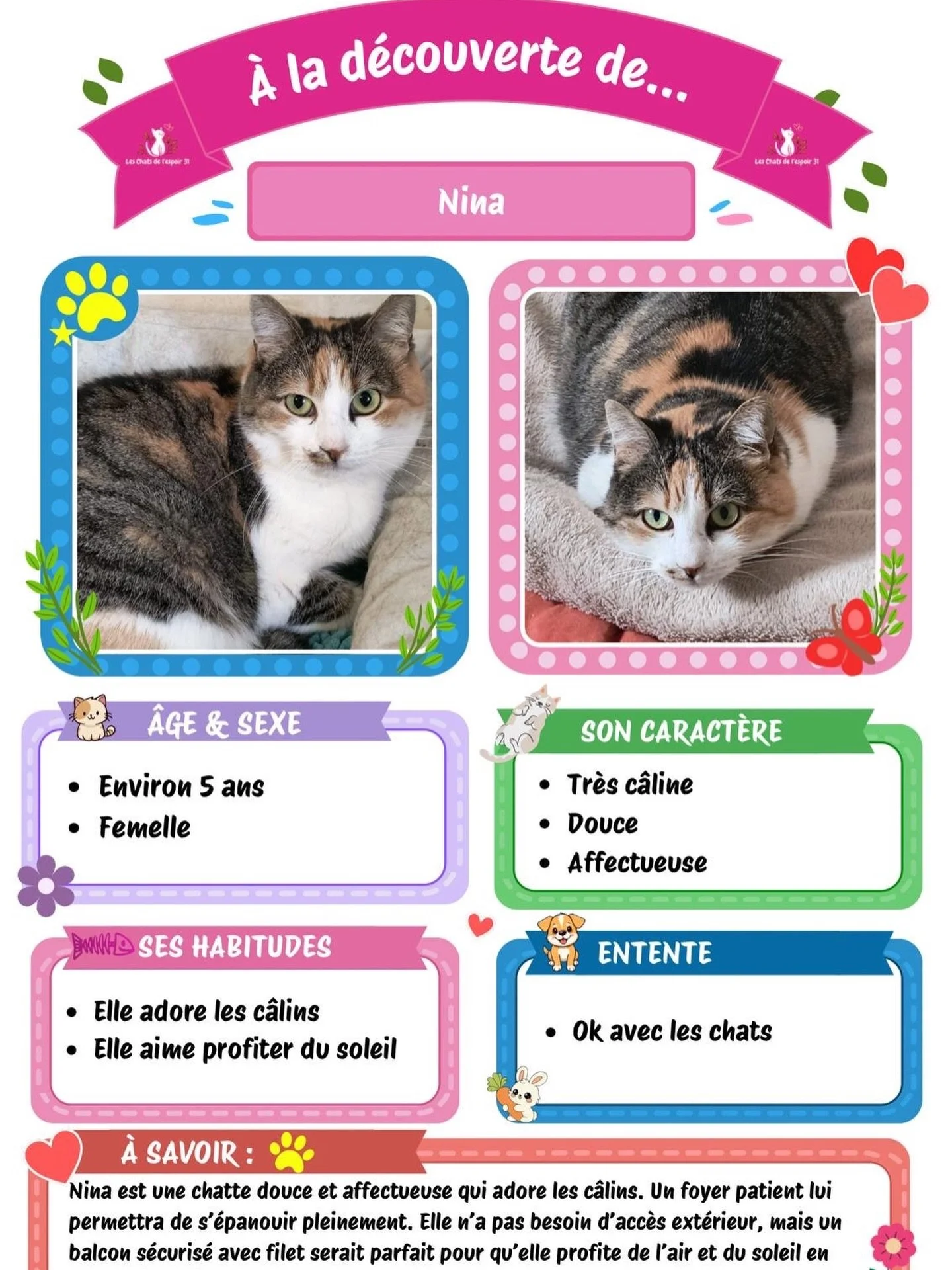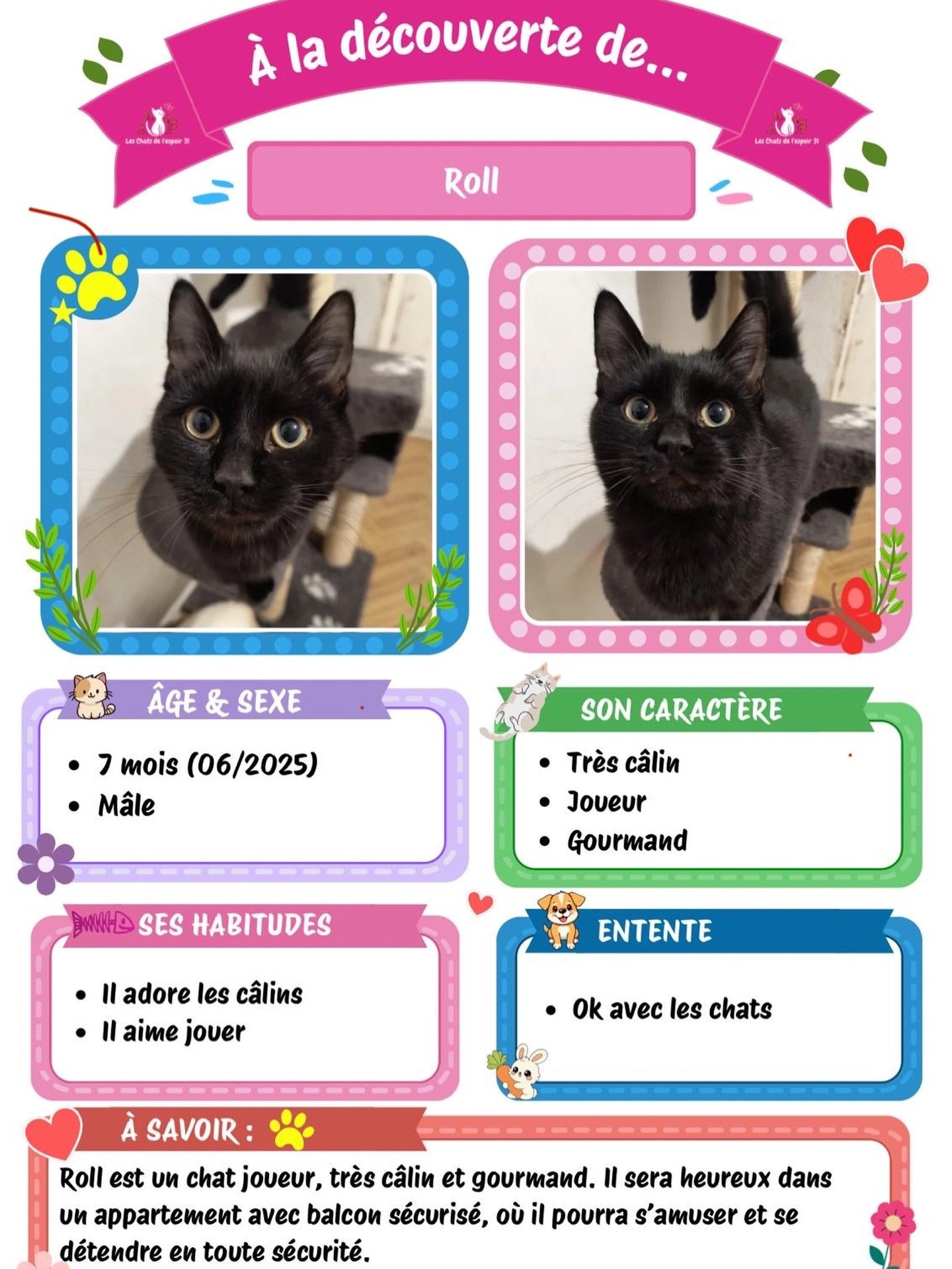 Depuis 2020, Les Chats de l’Espoir du 31 œuvrent avec cœur pour venir en aide aux chats en souffrance à Toulouse et dans toute la Haute-Garonne. Que ce soit des chats abandonnés, maltraités ou malades, notre association leur offre un refuge temporaire au sein de familles d’accueil bénévoles, où ils retrouvent douceur, soins et espoir. Chaque vie sauvée est une victoire, et chaque adoption, une nouvelle chance. Venez découvrir nos actions, nos histoires émouvantes, et comment, ensemble, nous pouvons leur offrir un avenir meilleur.