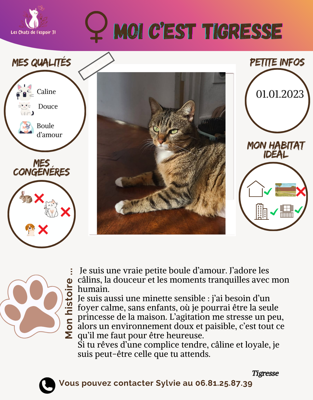 DerriĂšre son nom, Tigresse cache un cĆur tendre. TrĂšs cĂąline, trĂšs douce, elle a cependant besoin dâun foyer sans enfants et sans autres animaux, car la tranquillitĂ© est indispensable Ă son bien-ĂȘtre.
