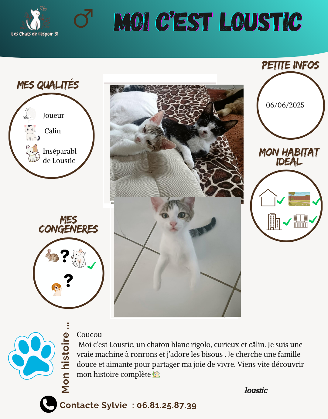 Bonjour 😺 Moi c’est Loustic, un adorable chaton blanc né cet été et déjà plein de vie ! On dit souvent que je suis un petit clown : je suis très curieux, je veux tout découvrir et je ne rate rien de ce que tu fais. Je suis aussi un grand gourmand, toujours prêt à accourir pour le repas 🍗.