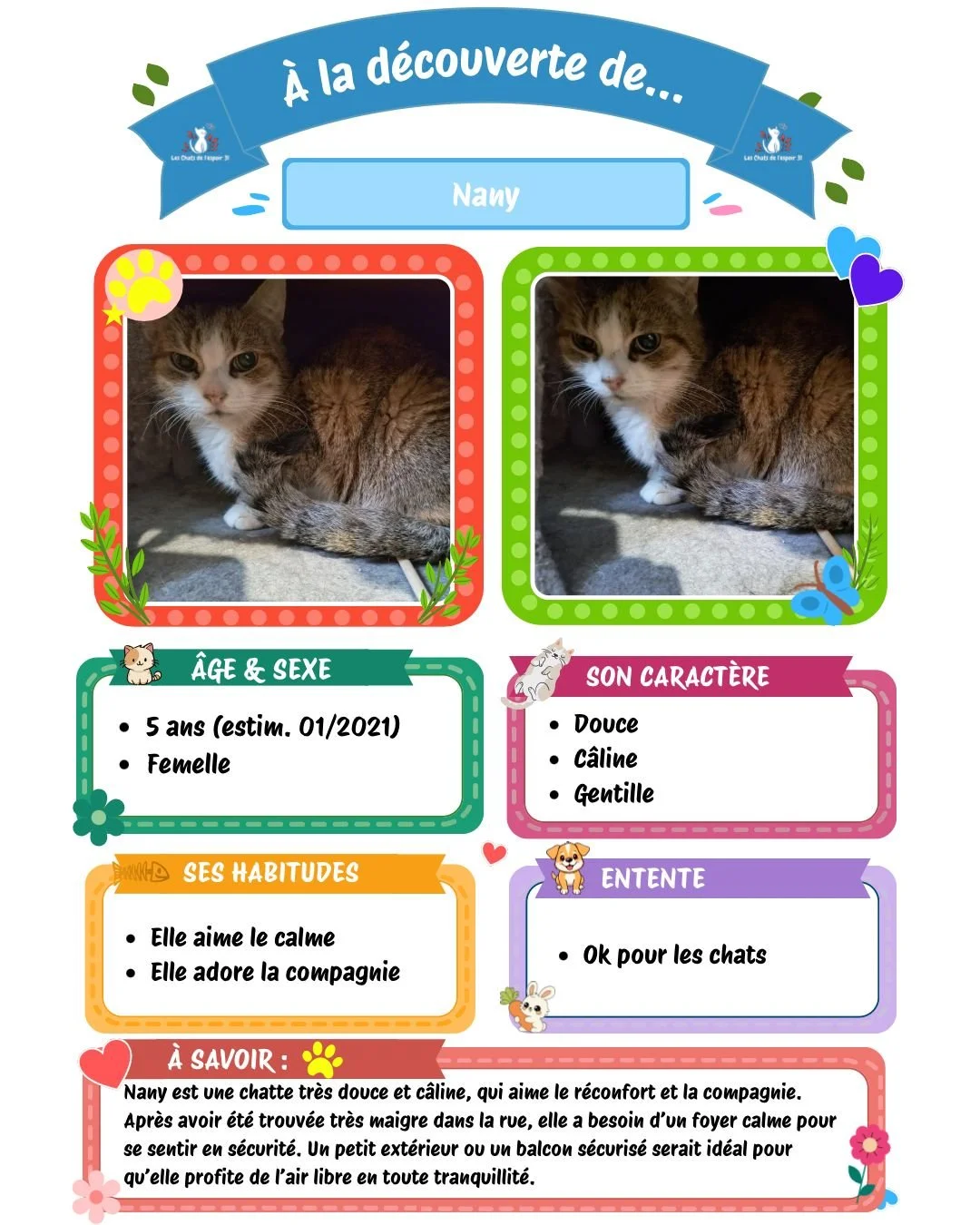 Chaque chat que nous recueillons a une histoire unique, souvent marquée par l’abandon, la maladie ou la souffrance. Grâce à l’amour de nos familles d’accueil bénévoles, ils retrouvent confiance, santé… et le goût de vivre.