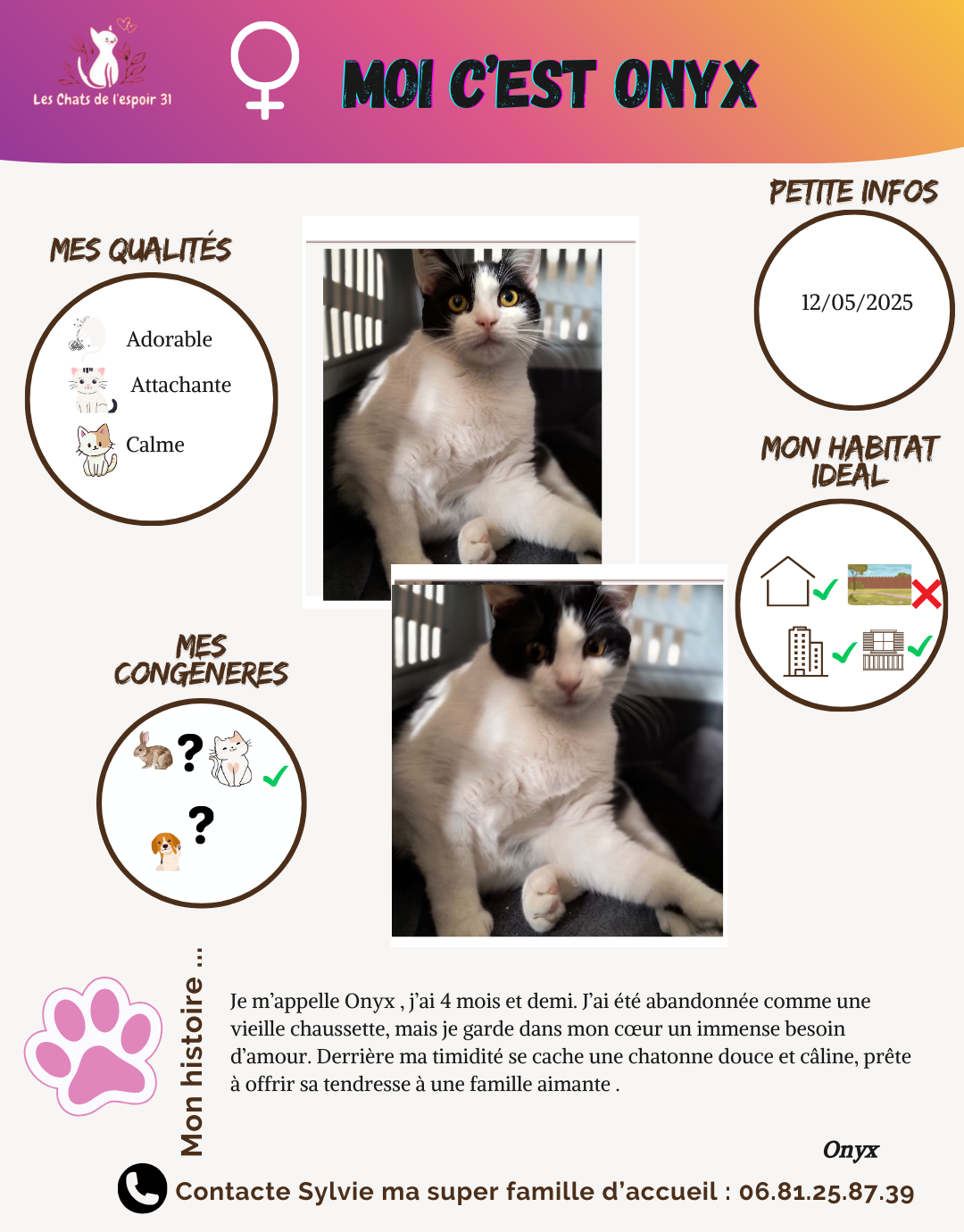 Grâce à l’association Les Chats de l’Espoir du 31, je peux maintenant espérer un avenir meilleur. Je recherche un foyer patient, respectueux et plein d’amour, qui saura m’accompagner dans ma croissance et m’aider à oublier ce début de vie injuste.