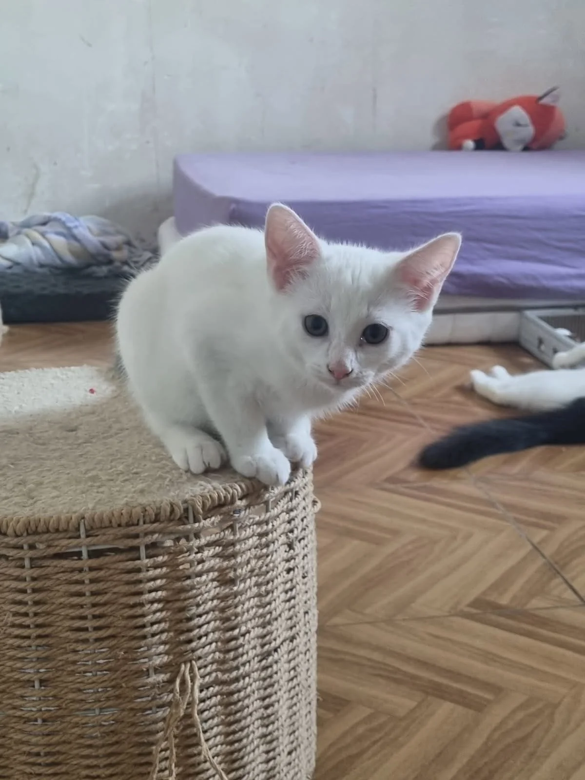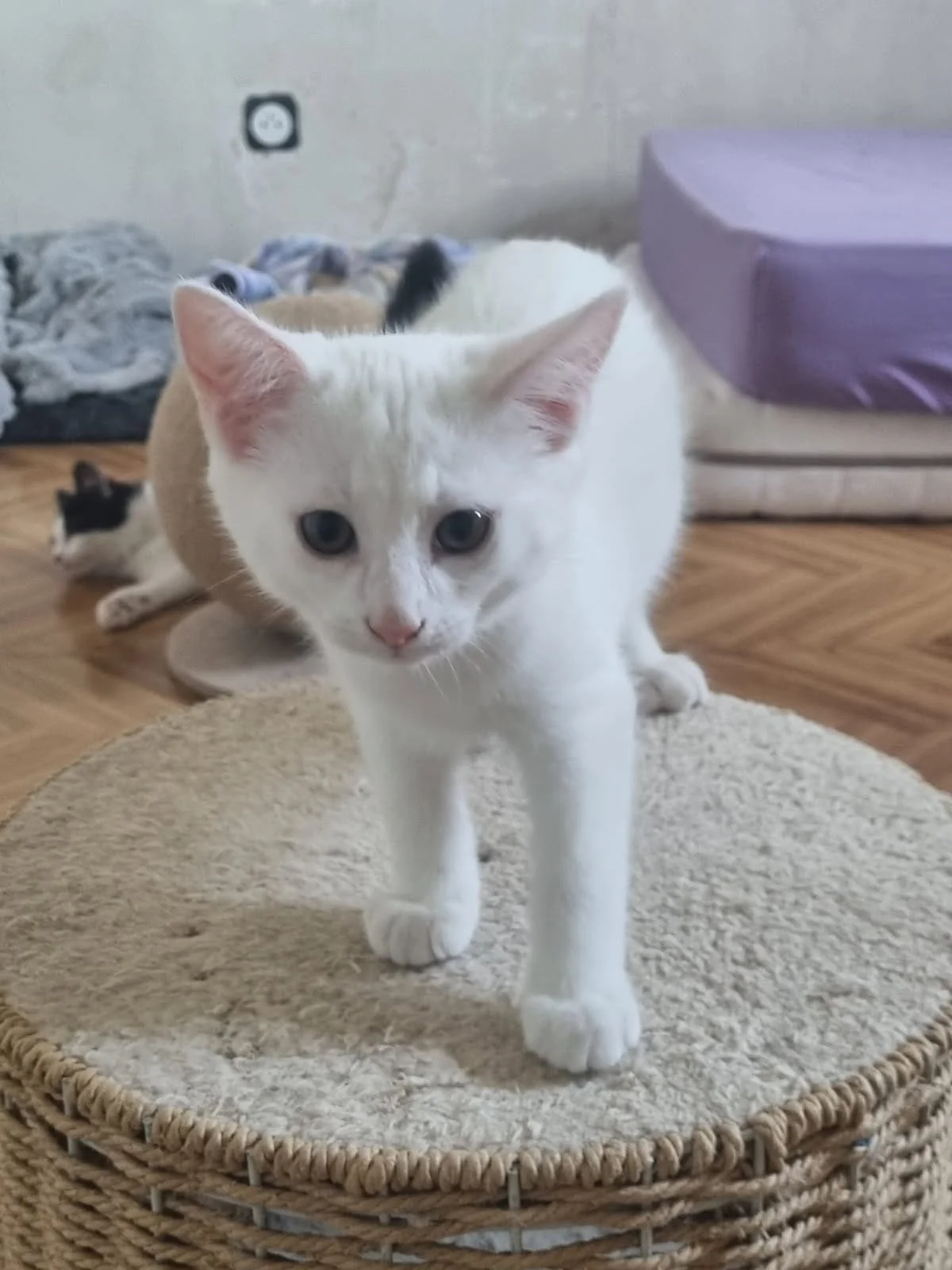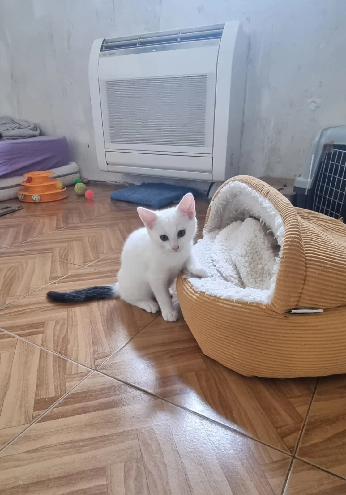 Bonjour, moi c’est Samson 🐱. Je suis né le 06/06/2025 et je suis un chaton européen tout blanc avec une belle queue noire. Je suis un petit explorateur toujours prêt à jouer, grimper et découvrir de nouvelles choses.
