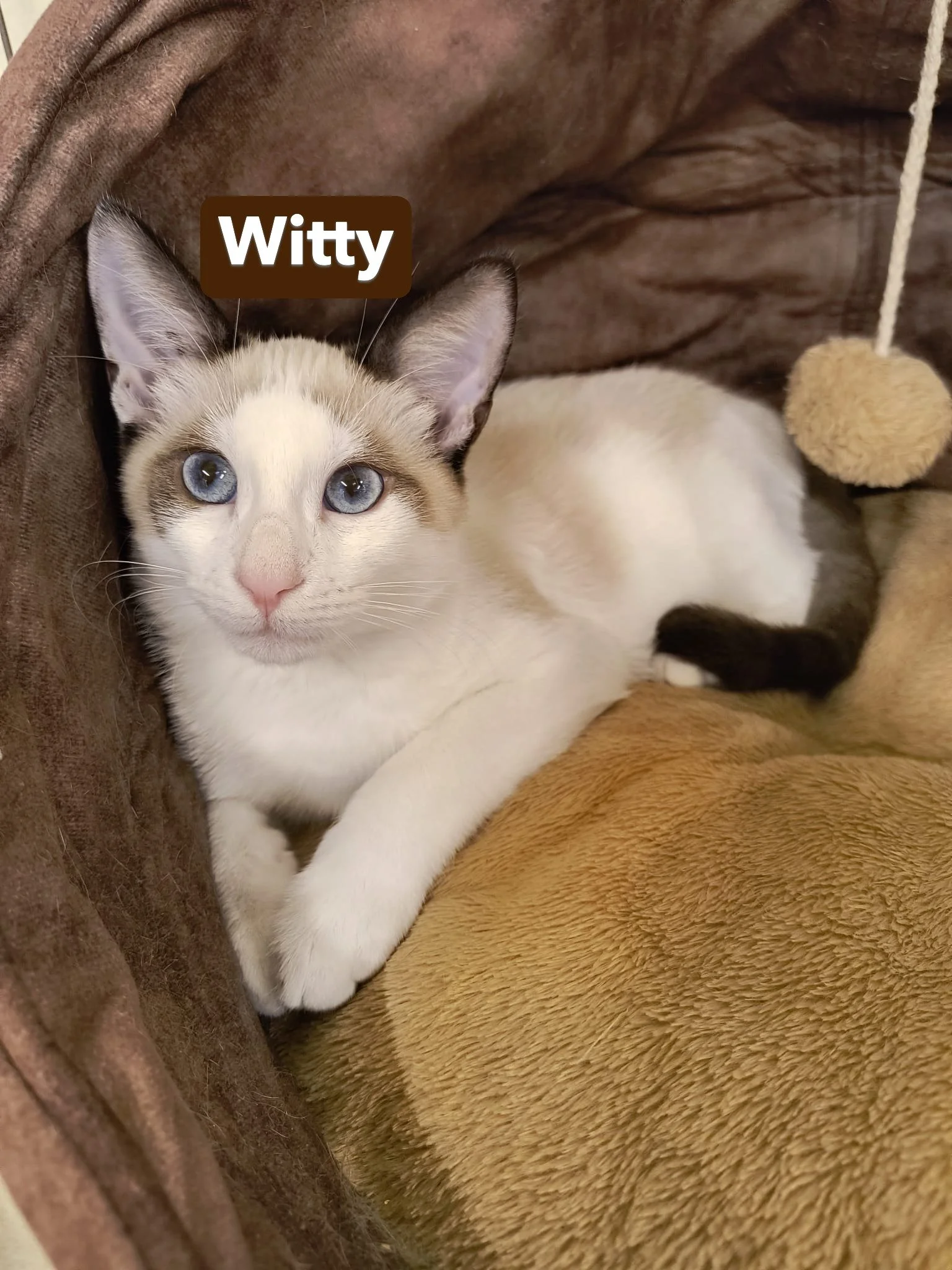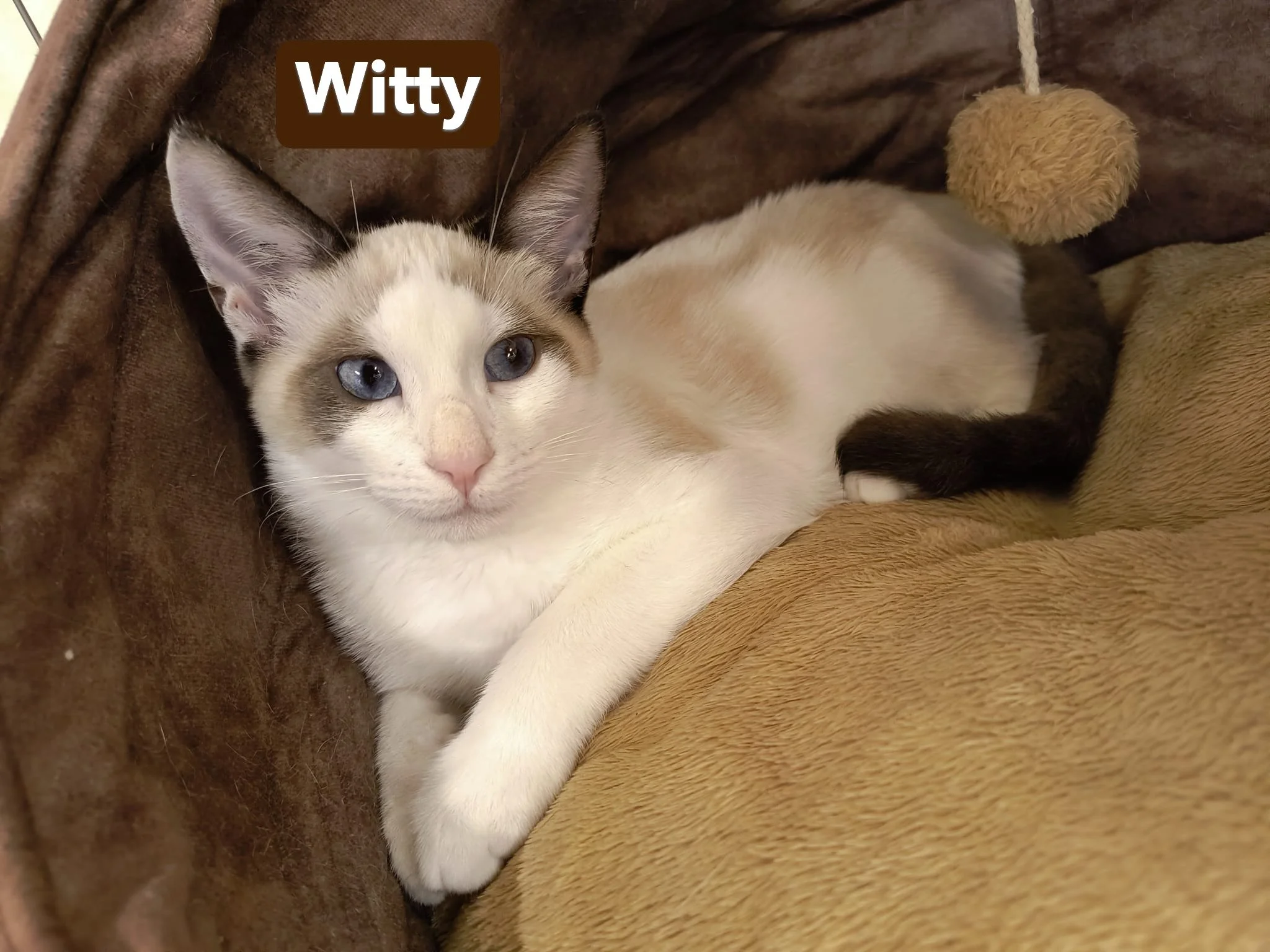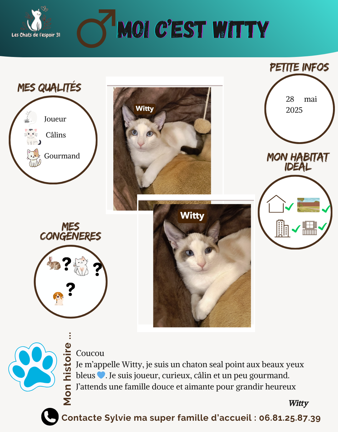 Coucou, moi câest Witty đŸ ! Je suis un joli chaton seal point, nĂ© avec de magnifiques yeux bleus qui font fondre tous ceux qui croisent mon regard. Je suis plein dâĂ©nergie et dâenthousiasme : jâadore courir, grimper, sauter et explorer chaque recoin de mon environnement. Rien ne mâĂ©chappe, je suis un vrai petit aventurier !